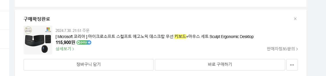 제가 2024년 7월 20일날 구입하였던 마이크로소프트 스컬프트 에고노믹 데스크탑 무선키보드+마우스세트에서